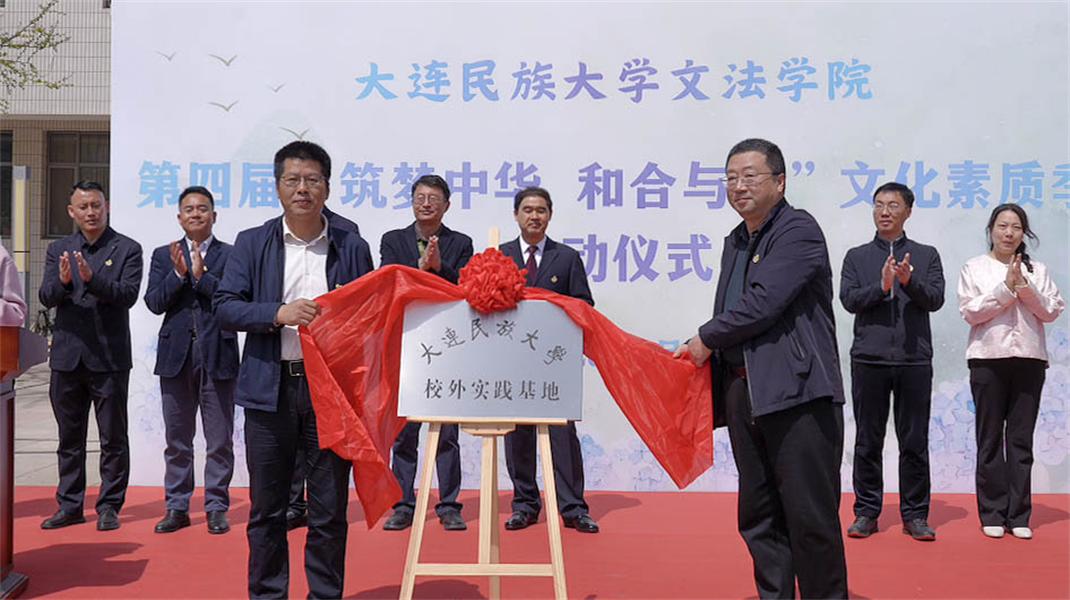 仪式现场举行了大连民族大学文法学院“校外实习基地”揭牌仪式。副校长哈正利与大连新闻传媒集团编委会专职编委张博共同为实习基地揭牌,标志着学院与行业单位协同育人工作迈上新台阶,学院将进一步为学生提供优质实习实训平台,助力提升应用型人才培养质量。